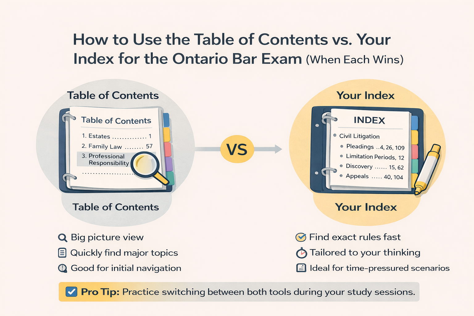 Preparing for the Ontario Bar Exam isn’t just about memorizing content — it’s about knowing how to quickly access the right information during the exam. Two tools stand out: the official Table of Contents (TOC) in your materials and your personalized index. But when should you rely on one over the other? Here’s the guide.